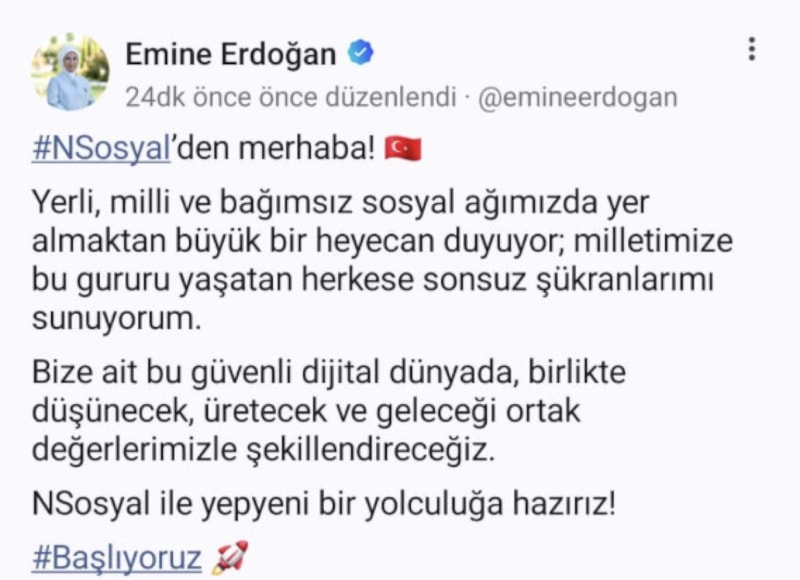 Cumhurbaşkanı Recep Tayyip Erdoğan'ın eşi Emine Erdoğan, Next Sosyal'den ilk paylaşımını, "Yerli, milli ve bağımsız sosyal ağımızda yer almaktan büyük bir heyecan duyuyor; milletimize bu gururu yaşatan herkese sonsuz şükranlarımı sunuyorum" ifadesiyle yaptı.