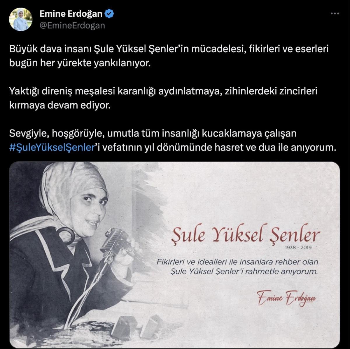 Emine Erdoğan, sosyal medya hesabından yaptığı paylaşımda, "Büyük dava insanı Şule Yüksel Şenler'in mücadelesi, fikirleri ve eserleri bugün her yürekte yankılanıyor. Yaktığı direniş meşalesi karanlığı aydınlatmaya, zihinlerdeki zincirleri kırmaya devam ediyor. Sevgiyle, hoşgörüyle, umutla tüm insanlığı kucaklamaya çalışan Şule Yüksel Şenler’i vefatının yıl dönümünde hasret ve dua ile anıyorum." ifadelerini kullandı.