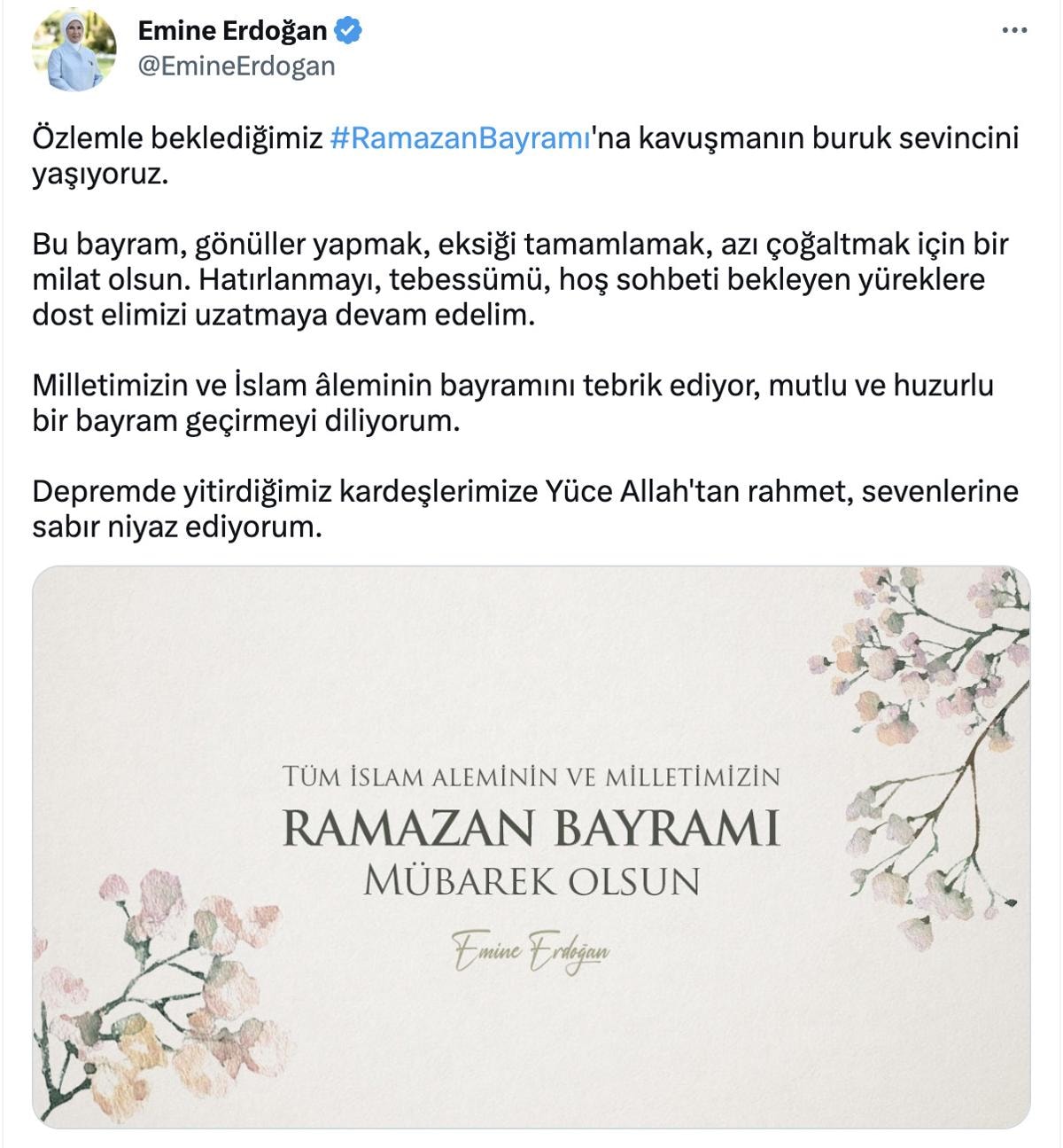 Cumhurbaşkanı Recep Tayyip Erdoğan'ın eşi Emine Erdoğan, Türk milletinin ve İslam aleminin Ramazan Bayramı'nı kutlayan bir mesaj yayınladı.
