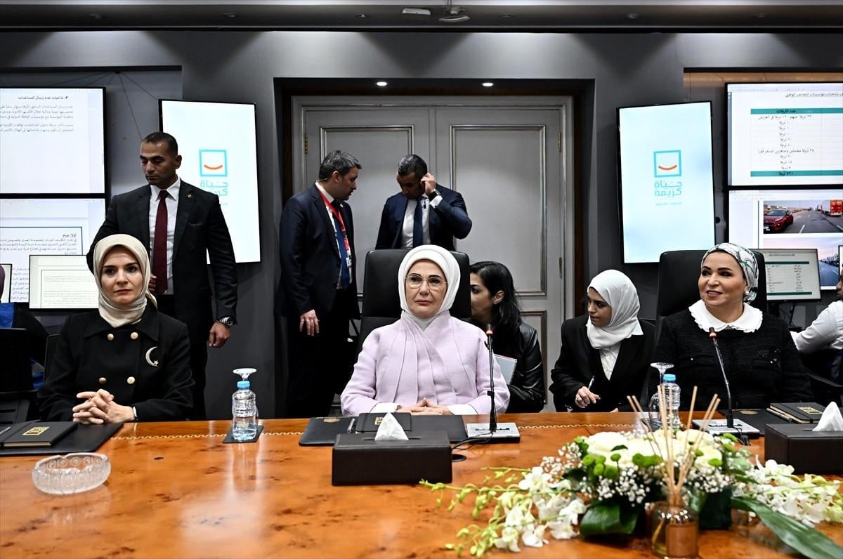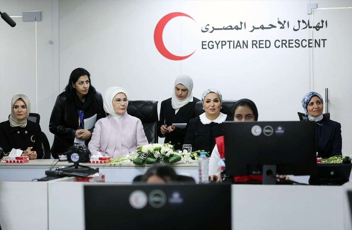 İlk olarak Mısır Kızılayı'nı ziyaret eden Emine Erdoğan, çalışmalara ilişkin bilgi aldı ve Gazze'ye yapılan yardımlara ilişkin tanıtım filmini izledi.