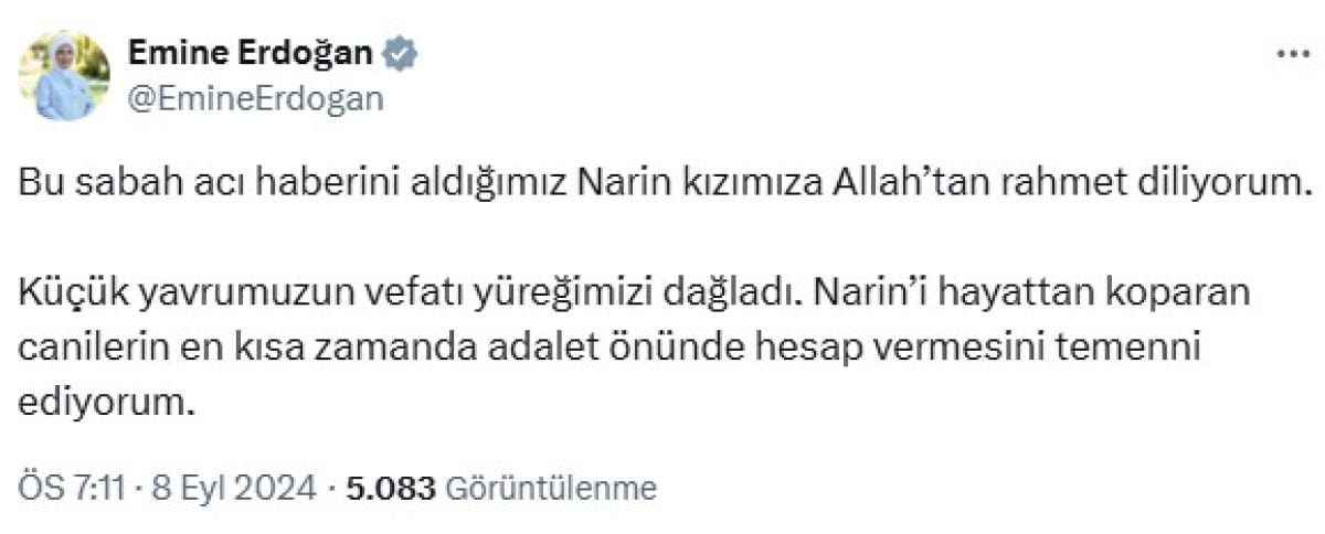 Cumhurbaşkanı Recep Tayyip Erdoğan'ın eşi Emine Erdoğan, sosyal medya hesabından Narin için taziye mesajı paylaştı.