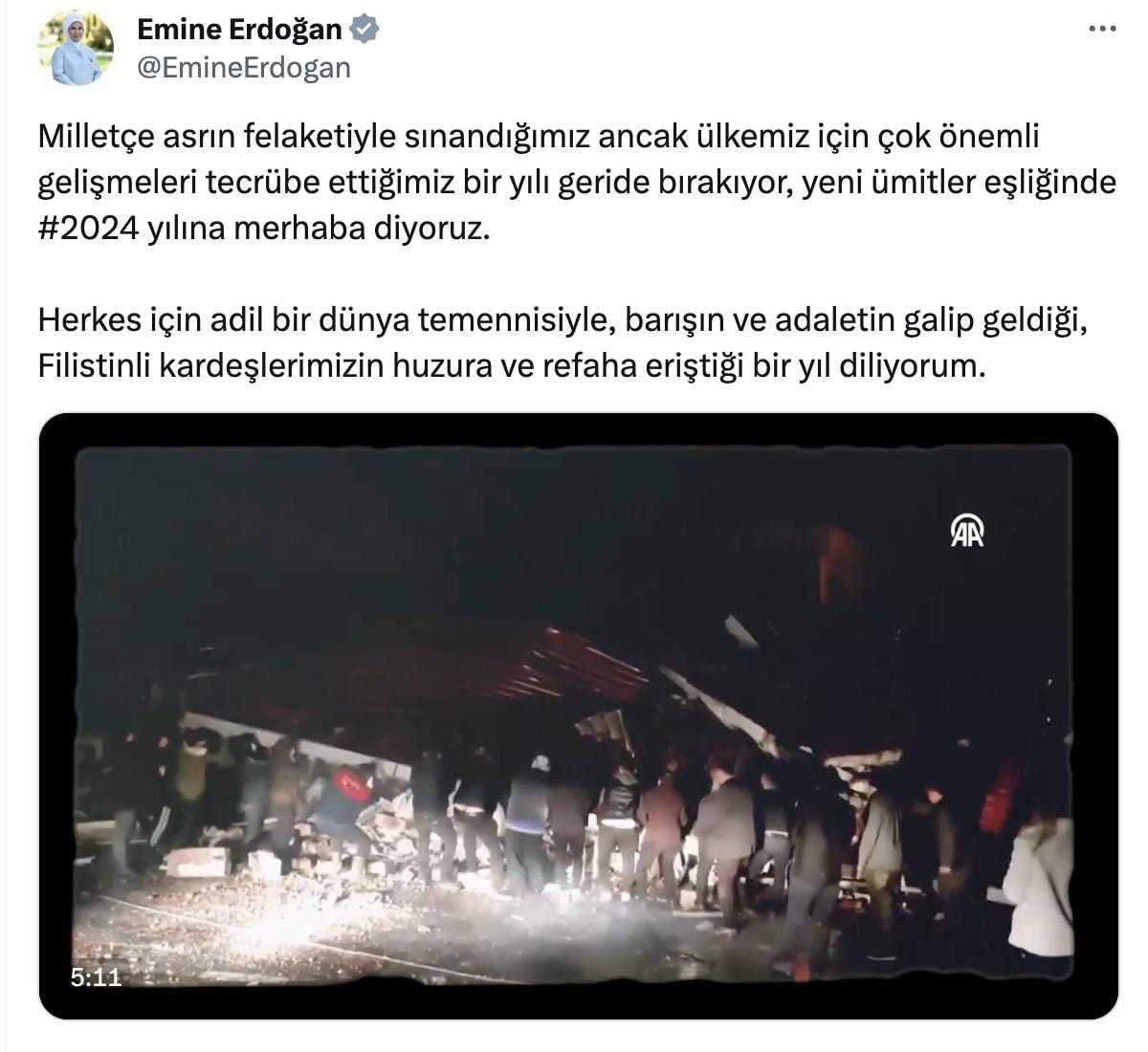 Emine Erdoğan, yeni yıla girerken yayınladığı mesajında, adil bir dünya temennisinde bulunurken barışa vurgu yaptı ve İsrail'in savaş açtığı Filistinlileri de unutmadı.