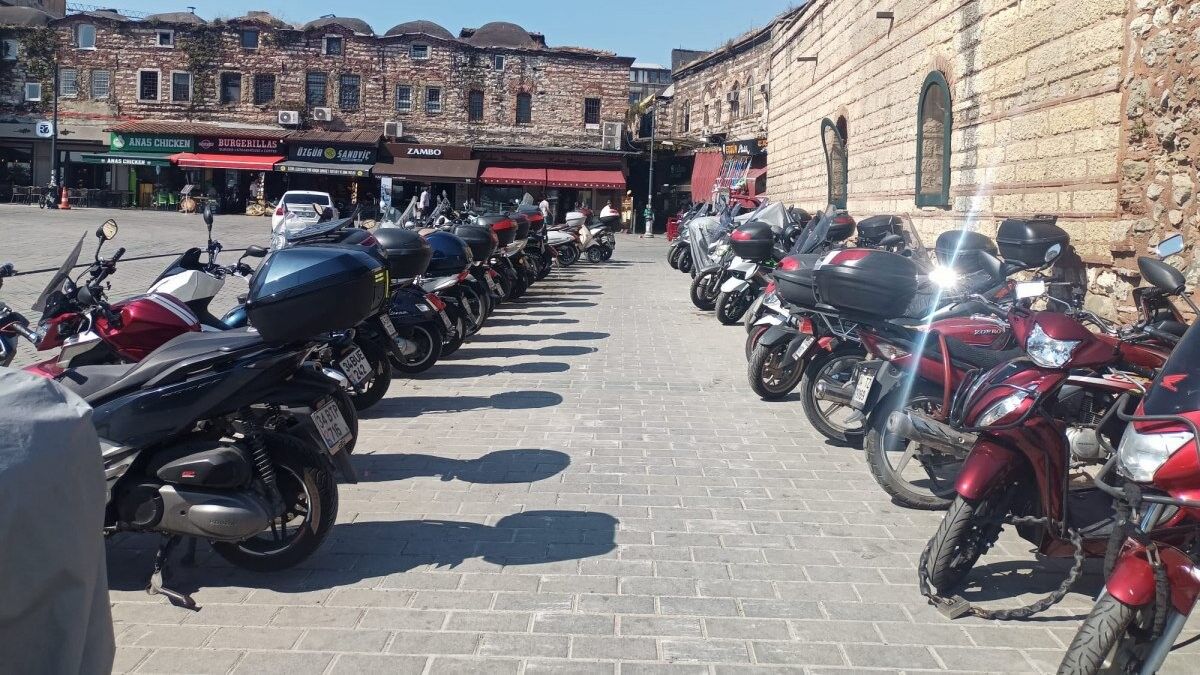 Her gün binlerce turist ve yerli halk tarafından ziyaret edilen Eminönü Meydanı'nda bulunan tarihi Rüstem Paşa Camii çevresi adeta motosiklet parkı haline geldi.