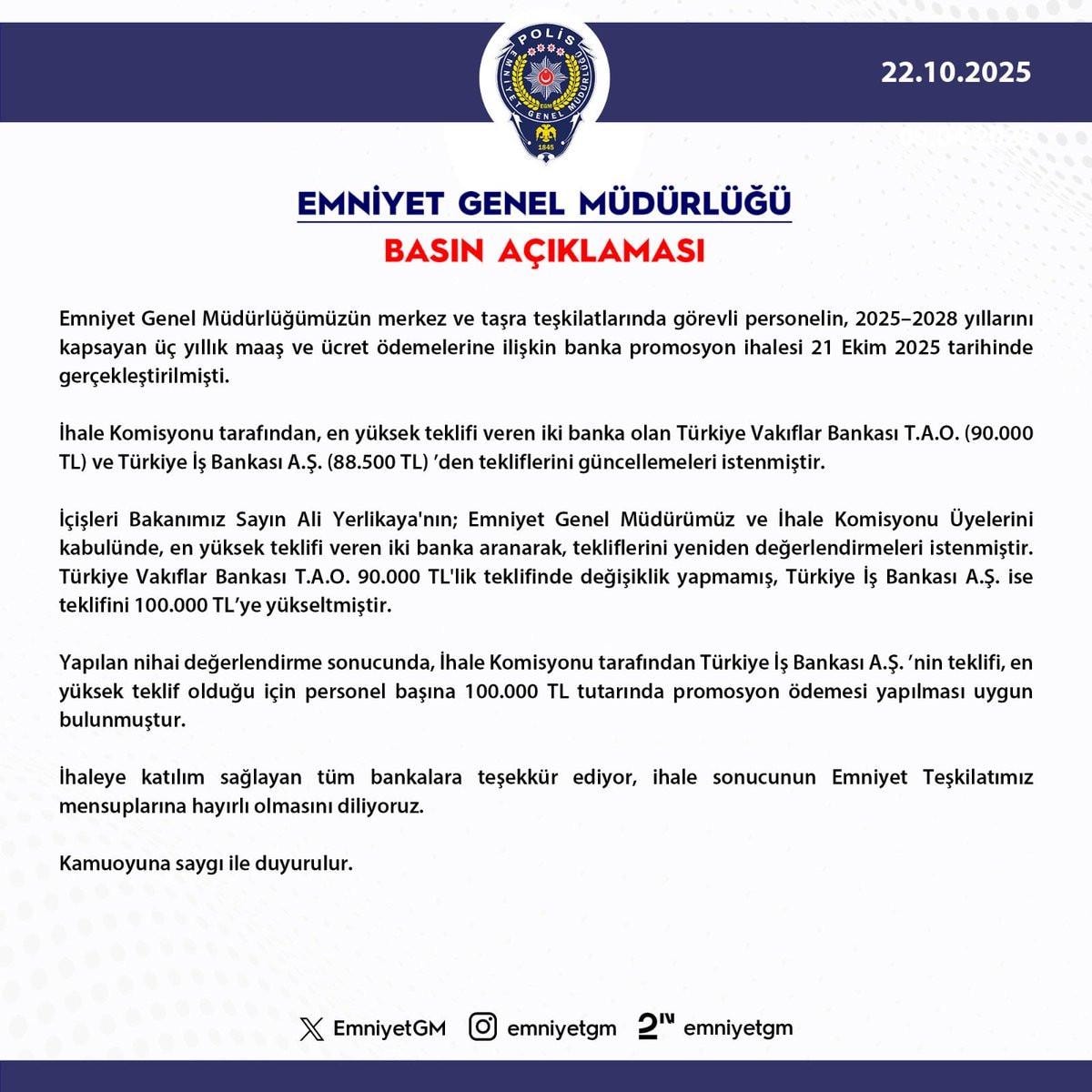 - Emniyet Genel Müdürlüğü, 2025-2028 yılları için maaş ve ücret ödemelerine ilişkin banka promosyon ihalesini sonuçlandırdı.