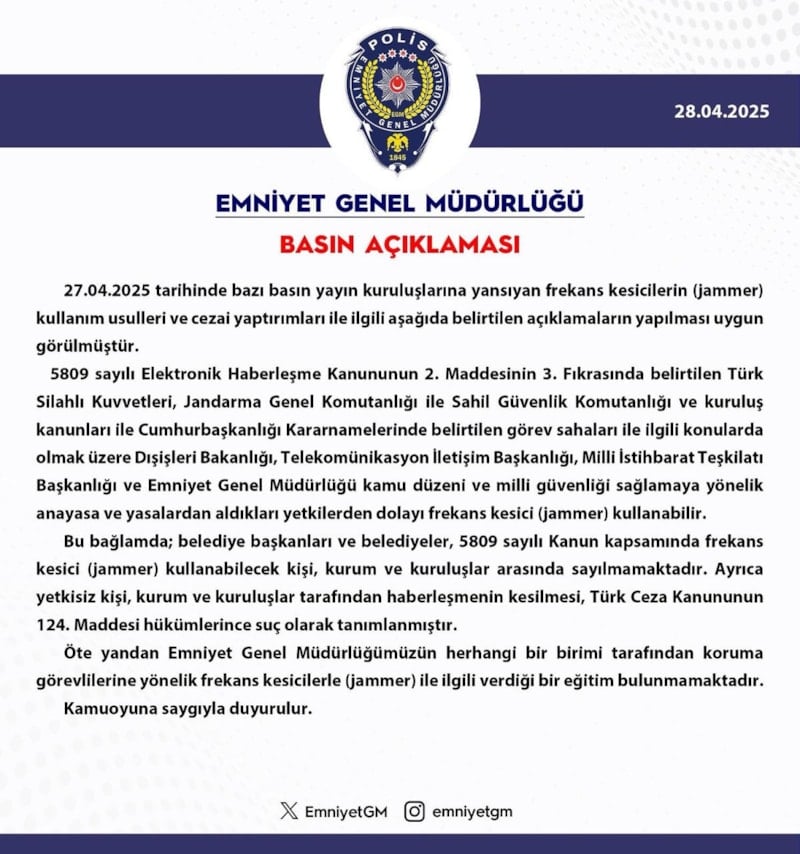 "27.04.2025 tarihinde bazı basın yayın kuruluşlarına yansıyan frekans kesicilerin (jammer) kullanım usulleri ve cezai yaptırımları ile ilgili aşağıda belirtilen açıklamaların yapılması uygun görülmüştür.