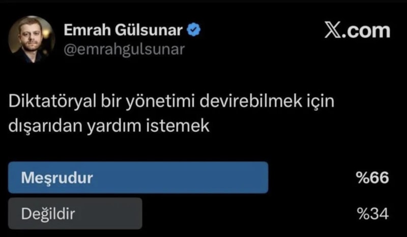 Geçtiğimiz günlerde X platformunda, "Diktatöryal bir yönetimi devirebilmek için dışarıdan yardım istemek" başlığıyla bir darbe anketi yapan Gülsunar'a, vatandaşlar tepki gösterdi