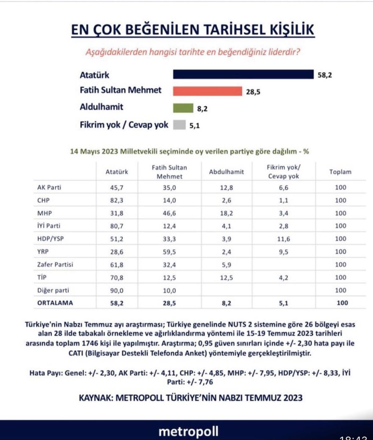 MHP'li seçmenler yüzde 46,6 ile Fatih Sultan Mehmet'i beğendiğini ifade ederken bu seçmen grubunda Atatürk yüzde 31,8'de kaldı.