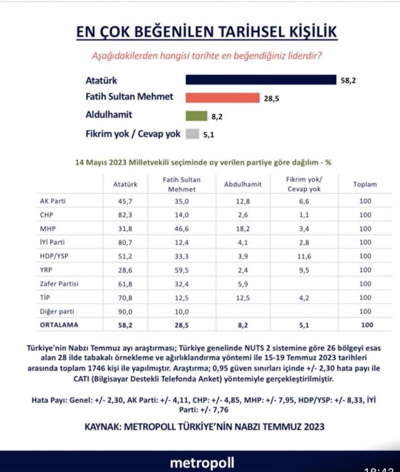 Metropoll araştırma şirketinin yaptığı 'en beğenilen tarihi kişilik' anketinde Atatürk diyenler yüzde 58,2 olurken Fatih Sultan Mehmet diyenler yüzde 28,5 oldu.