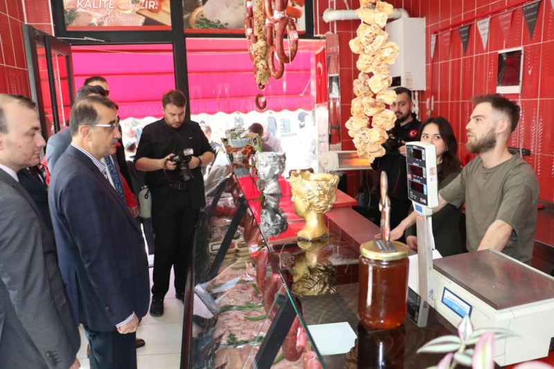 Bazı tezgahların başına geçerek satış da yapan Bakan Dönmez, Sütlüce Mahalle Muhtarı Mehmet Dipçin’i ziyaret etti.