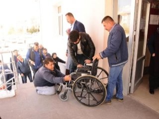 Nevşehir'de engelli bir genç oy kullancağı okulda engelli rampası olmayınca akülü aracından inerek merdivenleri emekleyerek çıktı.