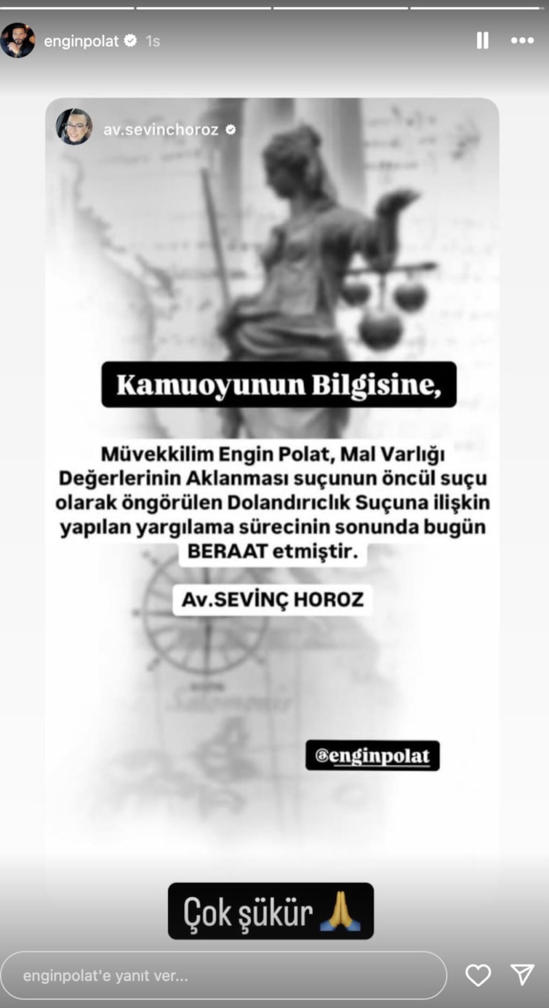 Polat çiftinin avukatı Sevinç Horoz, sosyal medya hesabından Engin Polat'a verilen beraat kararını paylaştı.