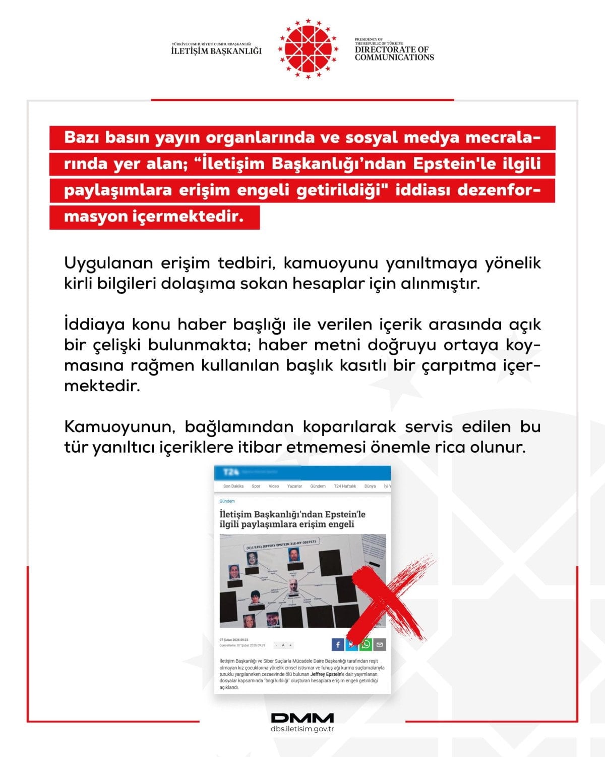 Bazı basın yayın organlarında ve sosyal medya mecralarında yer alan 'İletişim Başkanlığından Epstein'le ilgili paylaşımlara erişim engeli getirildiği' iddiası dezenformasyon içermektedir.