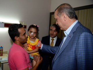 Hastane girişinde Sağlık Bakanı Mehmet Müezzinoğlu tarafından karşılanan Erdoğan, hastane yetkililerinden yaralıların sağlık durumuna ilişkin bilgi aldı. 5'i çocuk 15 yaralıdan 1'inin yoğun bakımda olduğu, diğerlerinin ise ortopedi servisinde tedavi gördüğü kaydedildi.