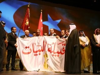 Dedeleri Kut'ül Amare'de şehit düşmüş aşiret liderlerinin, üzerinde Türk bayrağını simgeleyen ay yıldızın olduğu sancağı Erdoğan'a sunmasıyla program sona erdi.