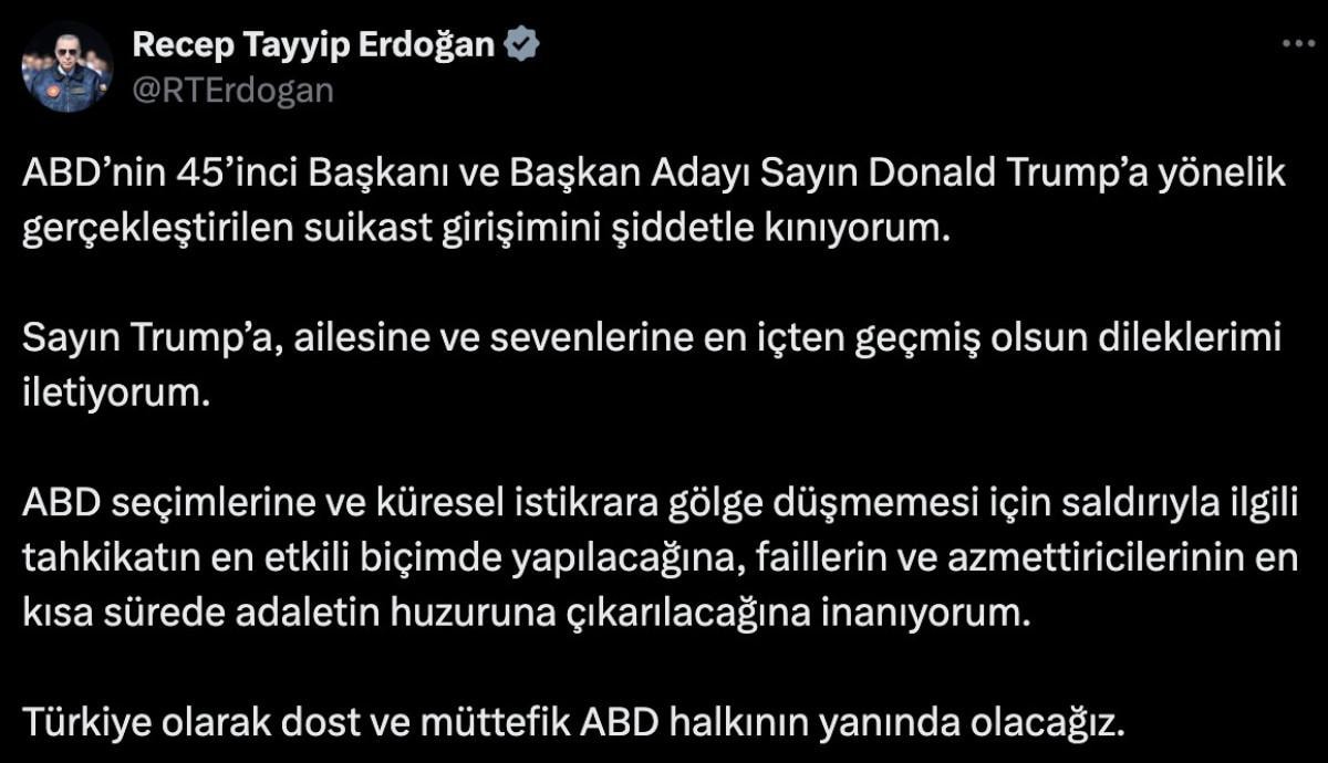 ABD’nin 45’inci Başkanı ve Başkan Adayı Sayın Donald Trump’a yönelik gerçekleştirilen suikast girişimini şiddetle kınıyorum.