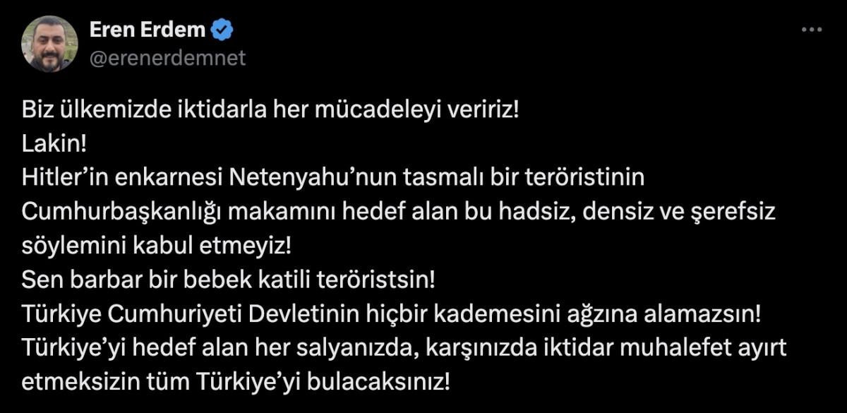 Biz ülkemizde iktidarla her mücadeleyi veririz! Lakin! Hitler’in enkarnesi Netenyahu’nun tasmalı bir teröristinin Cumhurbaşkanlığı makamını hedef alan bu hadsiz, densiz ve şerefsiz söylemini kabul etmeyiz! Sen barbar bir bebek katili teröristsin! Türkiye Cumhuriyeti Devleti'nin hiçbir kademesini ağzına alamazsın! Türkiye’yi hedef alan her salyanızda, karşınızda iktidar muhalefet ayırt etmeksizin tüm Türkiye’yi bulacaksınız!