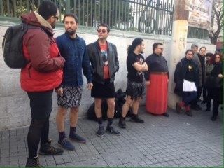 Üzerlerindeki etekle fotoğraf çektiren erkeklerin elinde "Tüm kadınlar için mini etekle yürüyorum" yazılı dövizler olduğu görüldü.