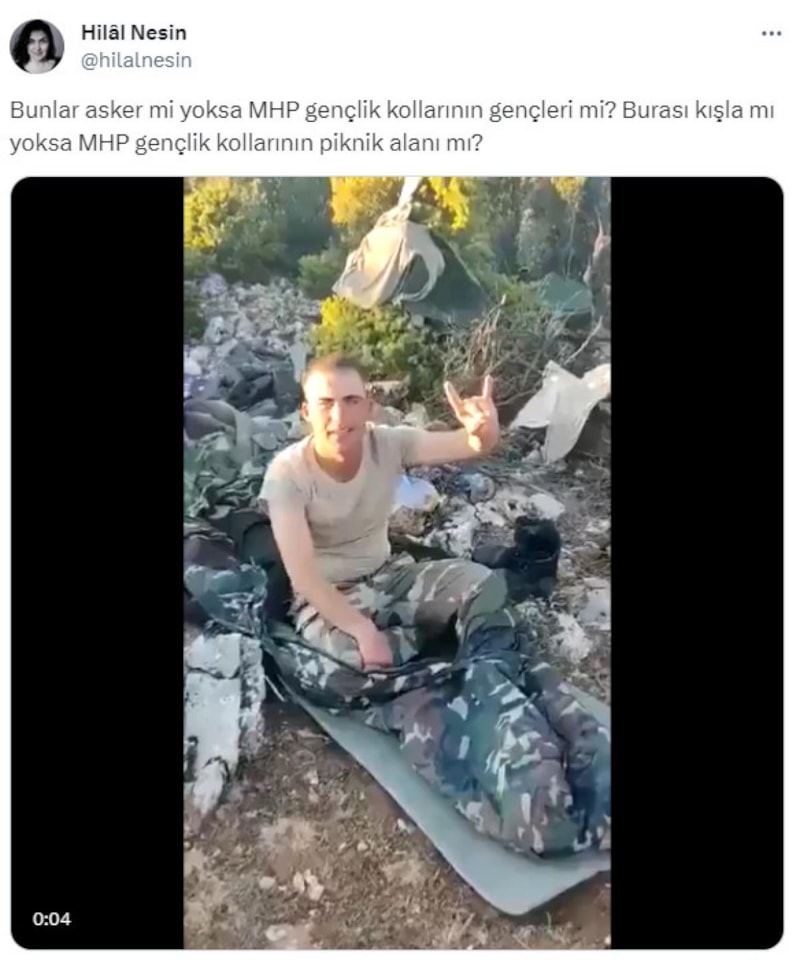 Nesin, bir arada olan Türk askerlerinin selam verdiği anları, "Bunlar asker mi yoksa MHP gençlik kollarının gençleri mi? Burası kışla mı yoksa MHP gençlik kollarının piknik alanı mı?" notuyla paylaştı.