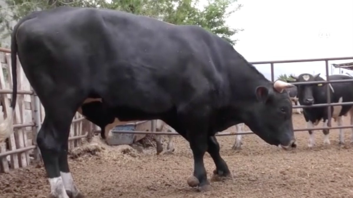 Büyükbaş hayvan yetiştiriciliği yapan Hasan Camekan'ın çiftliğinde büyüttüğü 30 aylık "Toro" ismini verdiği Holstein cinsi boğa, bugün 1 ton 300 kilogramlık ağırlığında.