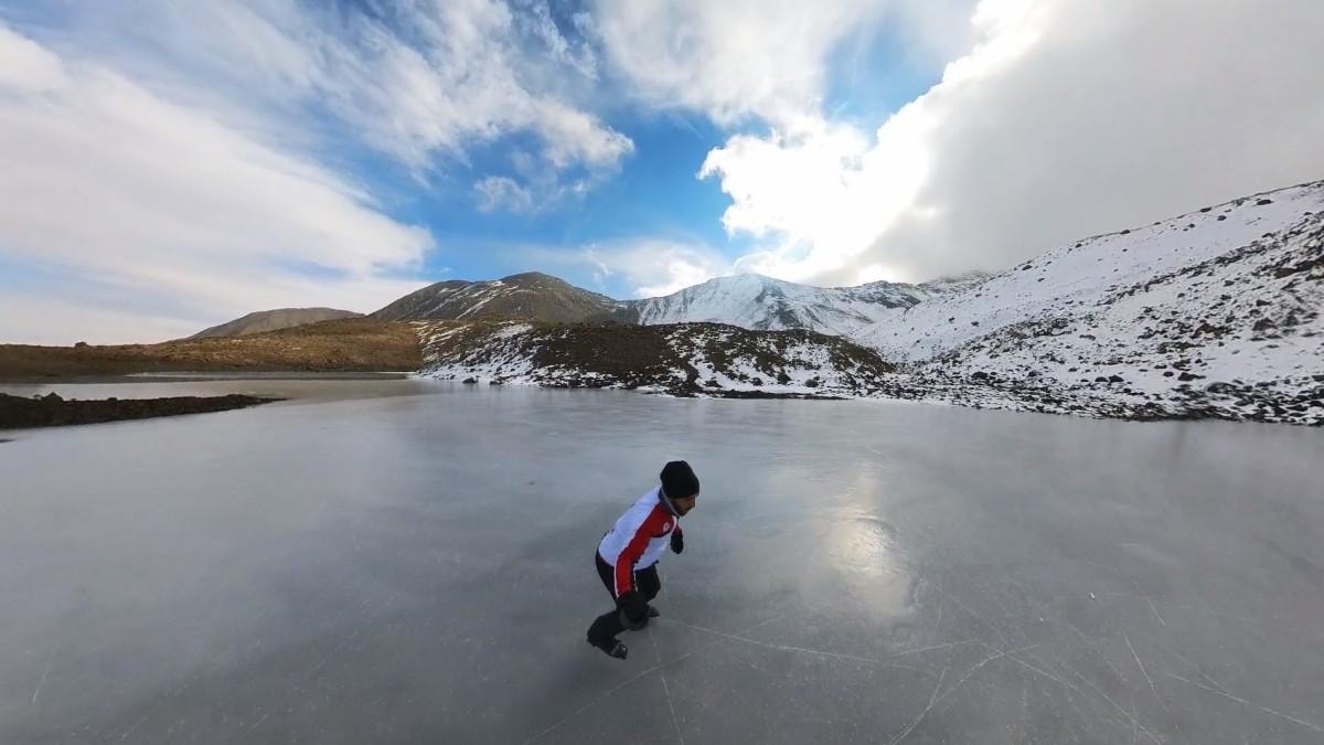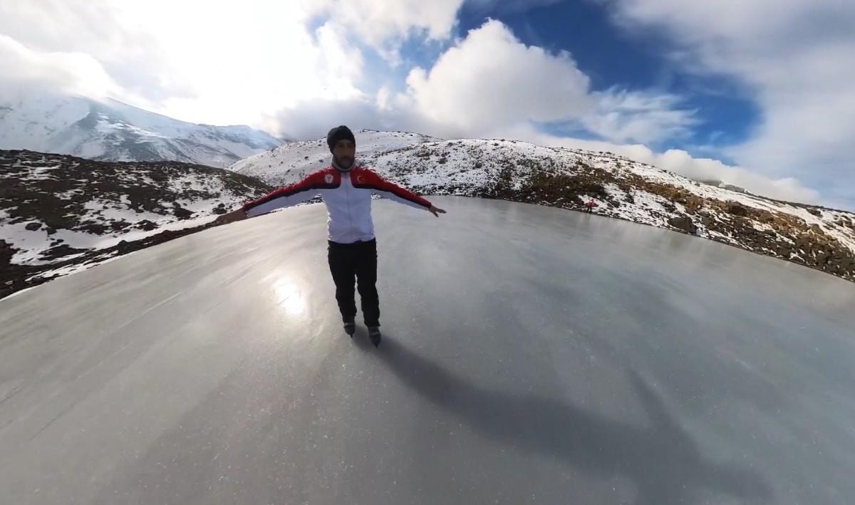 O anları kamerasıyla da anbean kayıt altına alan Atila, donan göl üzerinde yaklaşık 1 saat buz pateni yaptı.