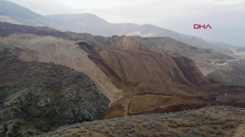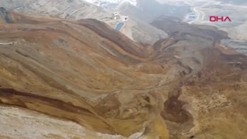 Erzincan'ın İliç ilçesinde altın madeni sahasında istiflenen tonlarca toprak kaydı. 9 işçiye ulaşılamazken, arama kurtarma çalışmaları sürüyor. Heyelan bölgesi havadan böyle görüntülendi.