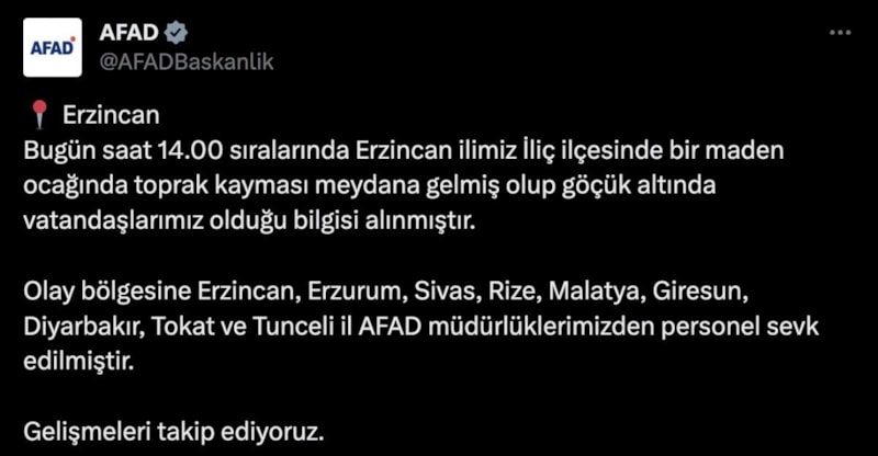 "Bugün saat 14.00 sıralarında Erzincan ilimiz İliç ilçesinde bir maden ocağında toprak kayması meydana gelmiş olup, göçük altında vatandaşlarımız olduğu bilgisi alınmıştır. Olay bölgesine Erzincan, Erzurum, Sivas, Rize, Malatya, Giresun, Diyarbakır, Tokat ve Tunceli il AFAD müdürlüklerimizden personel sevk edilmiştir. Gelişmeleri takip ediyoruz."