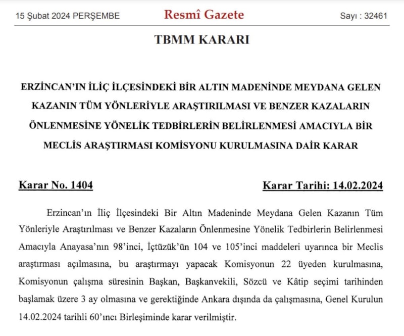 Erzincan'da maden ocağında meydana gelen toprak kaymasıyla ilgili TBMM'de araştırma komisyonu kurulmasına yönelik karar, Resmi Gazete'de yer aldı.