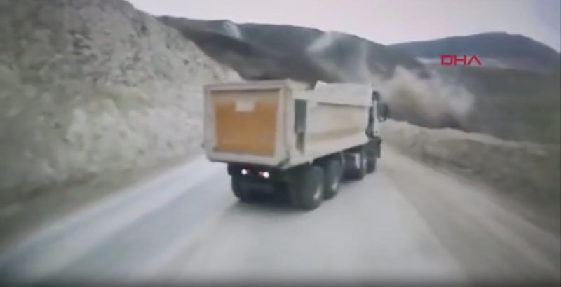 Kamyon içerisinden çekilen görüntülerde, karşılıklı ilerleyen kamyonların yaptıkları manevralarla toprak altında kalmaktan kıl payı kurtuldukları görüldü.