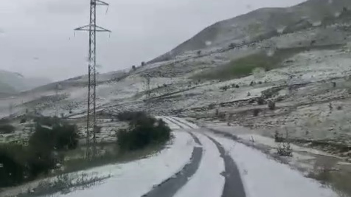 Erzurum'un Aziziye ilçesine bağlı Başkurtdere köyünde yoğun yağışla birlikte dereler taşarken dolu yağışı ile her yer beyaza büründü.
