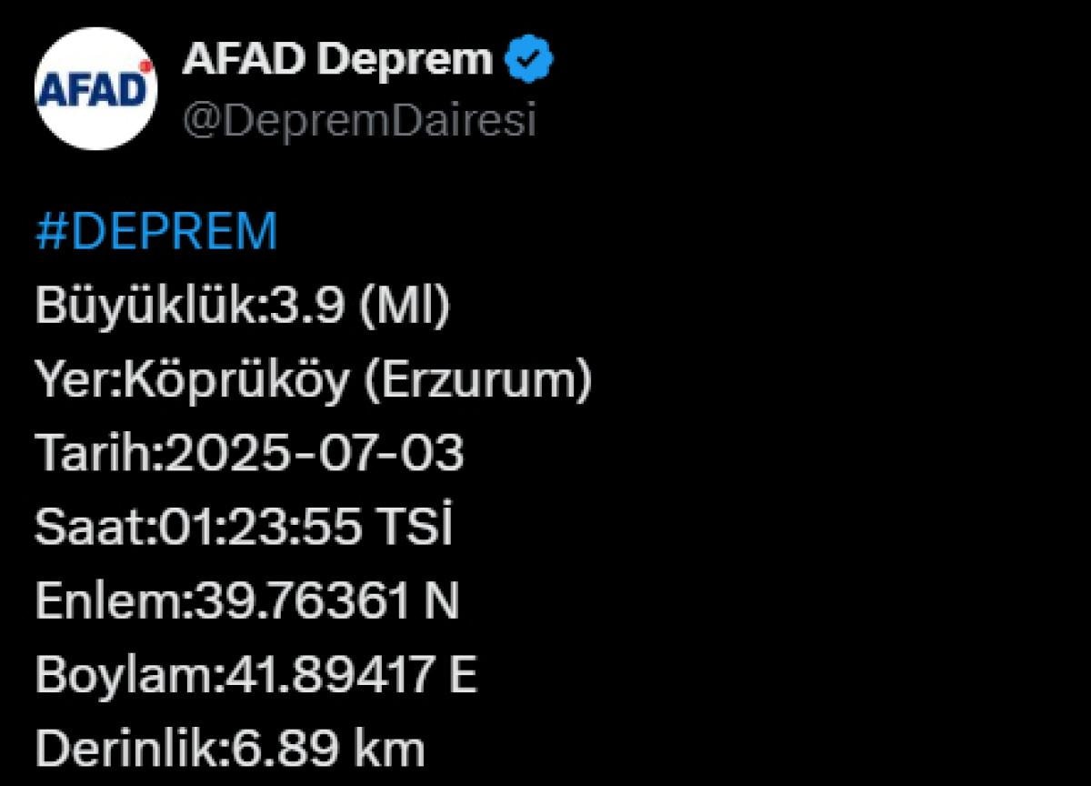 Bir deprem haberi de Erzurum'dan geldi.