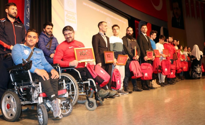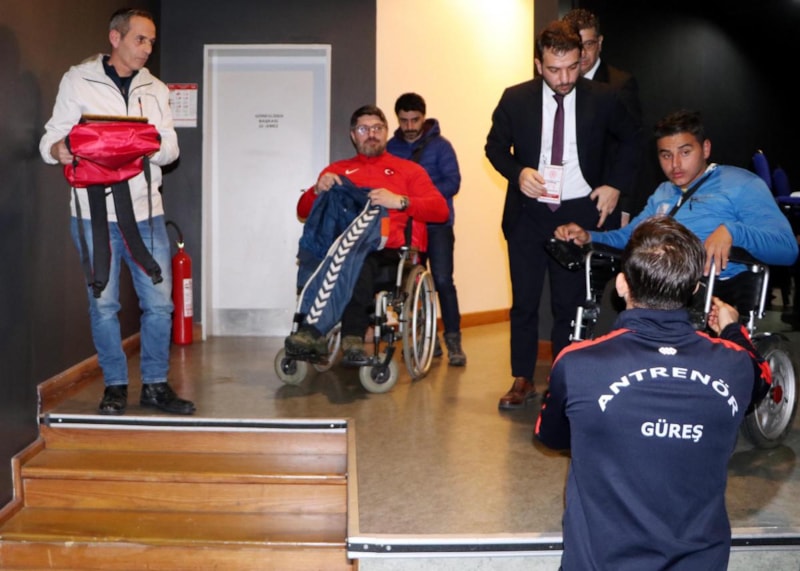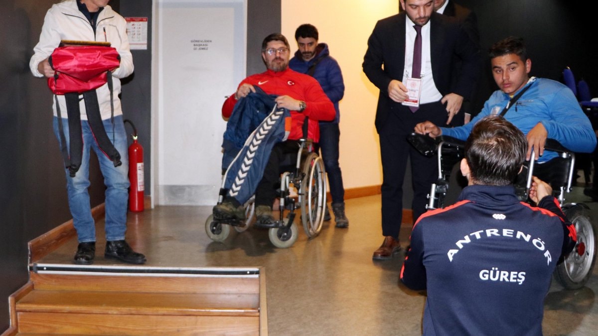 Erzurum'da başarılı sporcuların ödüllendirildiği 'Sporun Enleri' töreninde bedensel engelli şampiyonlar, sahneye ulaşmada engel yaşadı. 1 metre yüksekliğindeki sahneye tekerlekli sandalyeleriyle çıkamayan sporcular, arkadaşlarının kucağında taşındı.