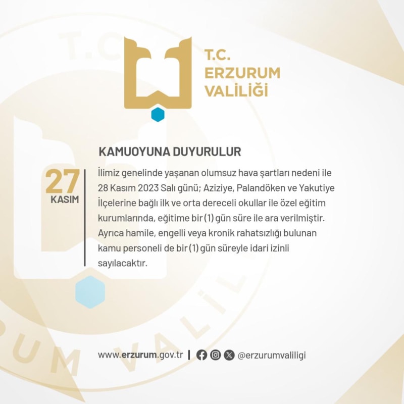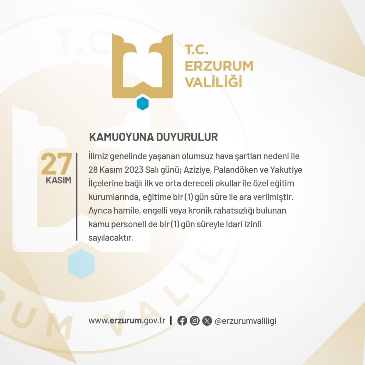 Erzurum Valiliği'nce Aziziye, Palandöken, Yakutiye ilçelerine bağlı ilk ve orta dereceli okullar ile özel eğitim kurumlarında 28 Kasım Salı günü eğitime ara verildiği açıklandı.