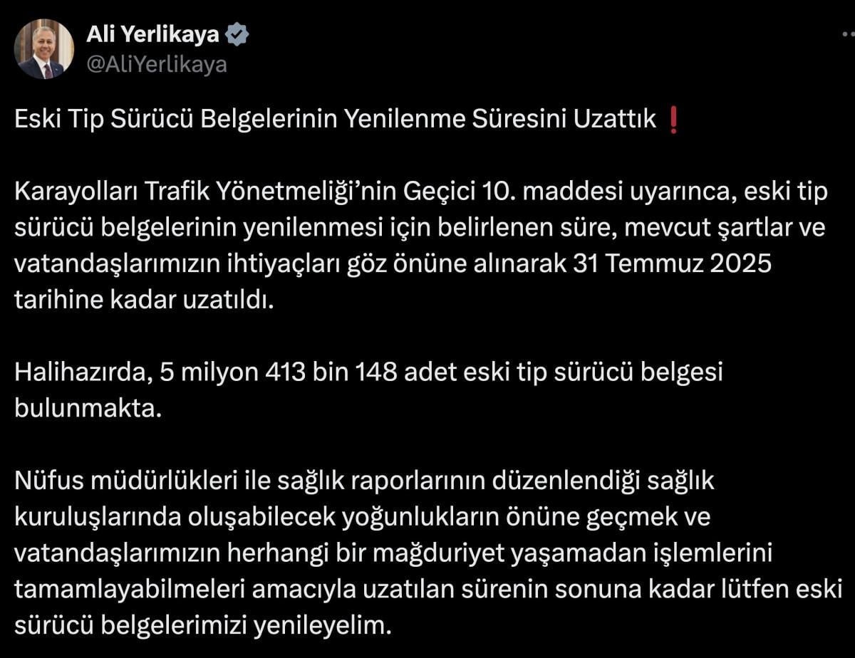 Yerlikaya, sosyal medya hesabından ehliyet yenileme süresinin uzatıldığını açıkladı.