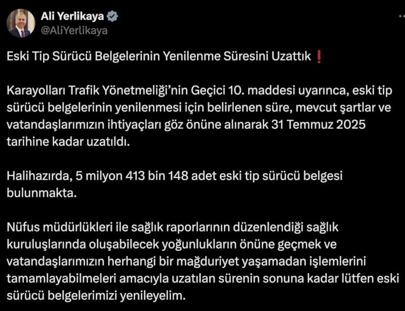 Karayolları Trafik Yönetmeliği’nin Geçici 10. maddesi uyarınca, eski tip sürücü belgelerinin yenilenmesi için belirlenen süre, mevcut şartlar ve vatandaşlarımızın ihtiyaçları göz önüne alınarak 31 Temmuz 2025 tarihine kadar uzatıldı.