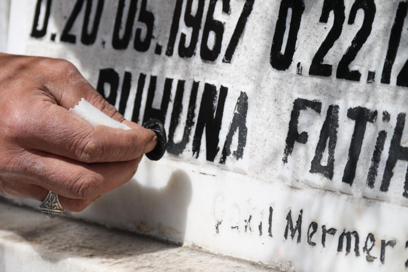 Çoğu kimsenin girmeye çekindiği mezarlıklarda ekmeğini kazanan Şahinli, mezar taşındaki yıpranmış yazıların yeniden boyuyor.