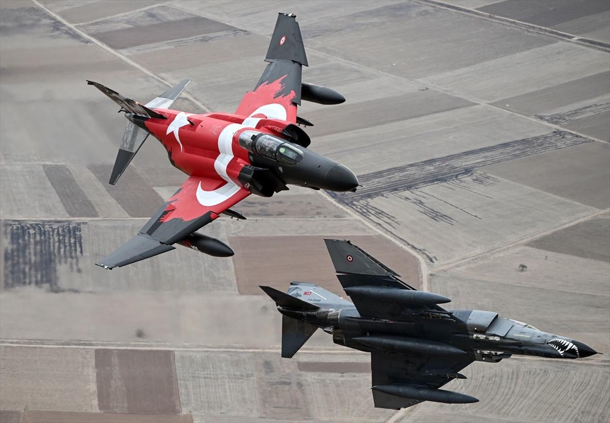 Üçlü kol uçuşu yapan "F-4E Phantom" uçakları, pozisyon alarak havada yer hedeflerine taarruza ilişkin eğitim faaliyeti icra etti.