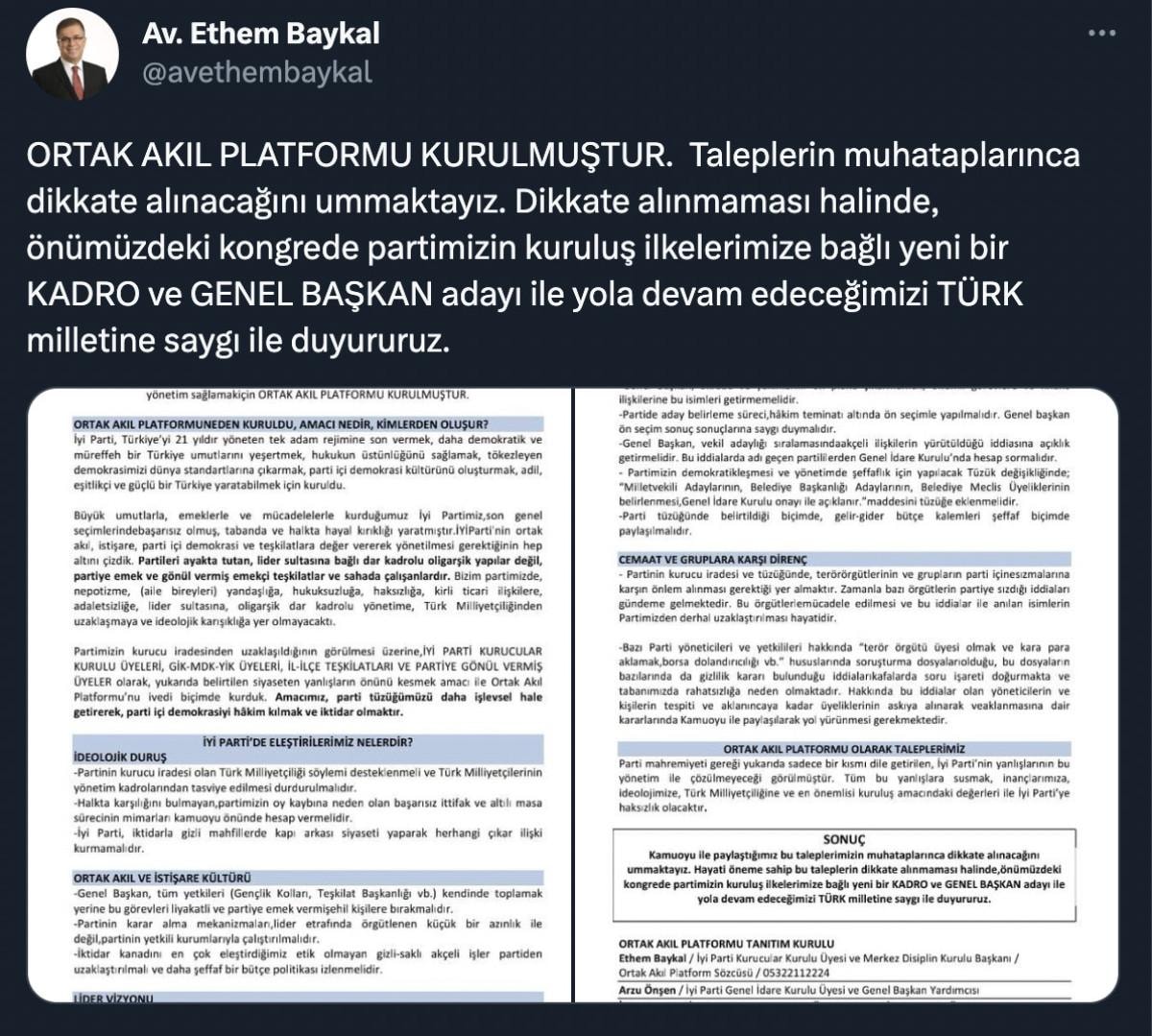 İyi Parti Genel Merkez Disiplin Kurulu Başkanı Etkem Baykal, Ortak Akıl Platformu kurulduğunu duyurdu.
