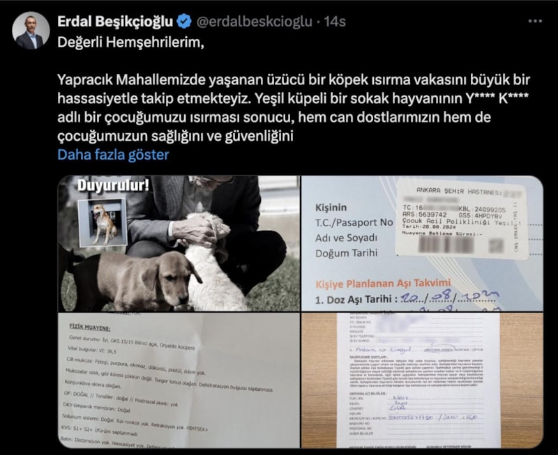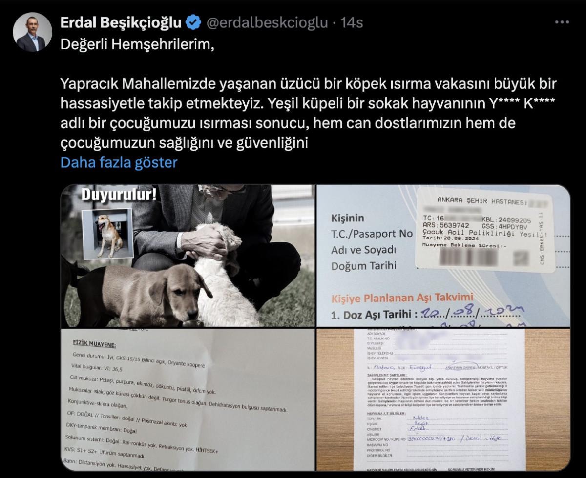 Beşikçioğlu, sosyal medya hesabından yaptığı açıklamada, Ankara'nın Etimesgut ilçesi Yapracık Mahallesi'nde yaşanan köpek ısırma vakasını büyük bir hassasiyetle takip ettiğini ifade etti.