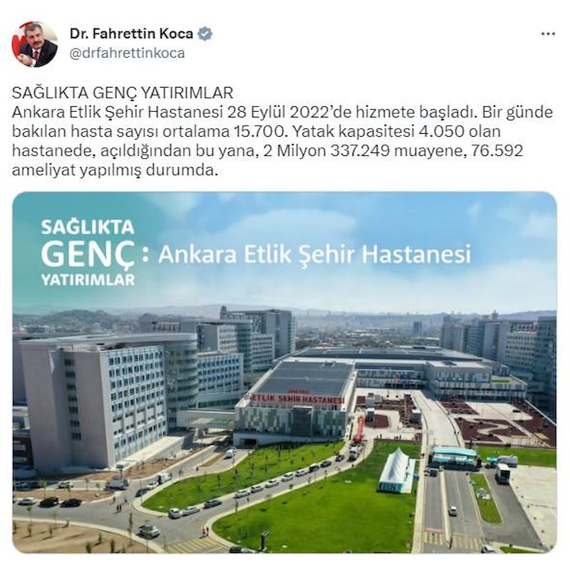 Sağlıkta en önemli reformlardan biri olan şehir hastanelerine yönelik memnuniyetler artıyor. Sağlık Bakanı Fahrettin Koca, Ankara Etlik Şehir Hastanesi'nin bir günde bakılan hasta sayısının ortalama 15 bin 700 olduğunu duyurdu.