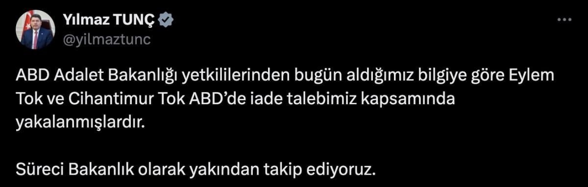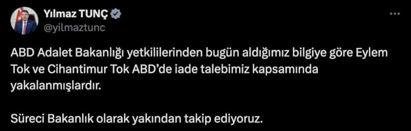 Sosyal medya hesabından açıklama yapan Bakan Tunç, “ABD Adalet Bakanlığı yetkililerinden bugün aldığımız bilgiye göre Eylem Tok ve Cihantimur Tok, ABD'de iade talebimiz kapsamında yakalanmışlardır. Süreci bakanlık olarak yakından takip ediyoruz.” dedi.