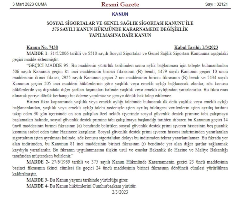 Emeklilikte yaşa takılanlar (EYT) düzenlemesi Resmi Gazete'de yayınlanarak yürürlüğe girdi. Aylık bağlanması talebinde bulunanlar, yaş dışındaki diğer şartları taşımaları halinde yaşlılık veya emekli aylığından yararlanacak. Emekli olduktan sonra aynı iş yerinde 30 gün içinde tekrar işe başlayan bütün çalışanlar için yüzde 5 destek primi verilecek.
