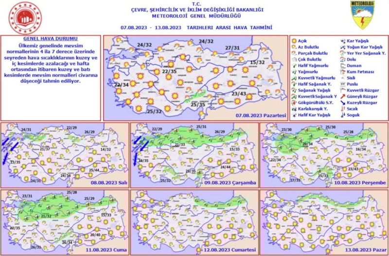 Meteoroloji Genel Müdürlüğü, 7-11 Ağustos tarihlerine ilişkin hava durumu tahminlerini paylaştı.