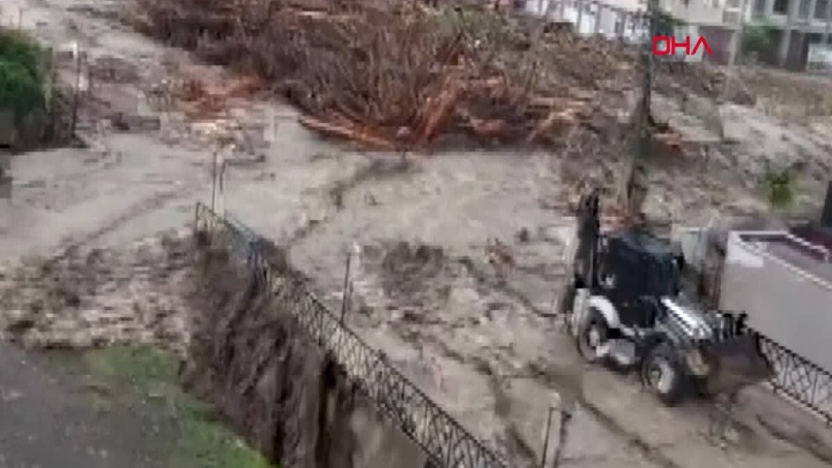 Çayın kenarındaki binalardan birinin balkonundan çekilen görüntüde, şiddetli yağış ile birlikte su seviyesi yükselen çayda sürüklenen ağaç ve kütüklerin, ilçe merkezindeki köprüyü tıkadığı görüldü.