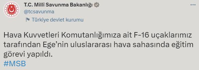 Hava Kuvvetleri Komutanlığımıza ait F-16 uçaklarımız tarafından Ege’nin uluslararası hava sahasında eğitim görevi yapıldı.