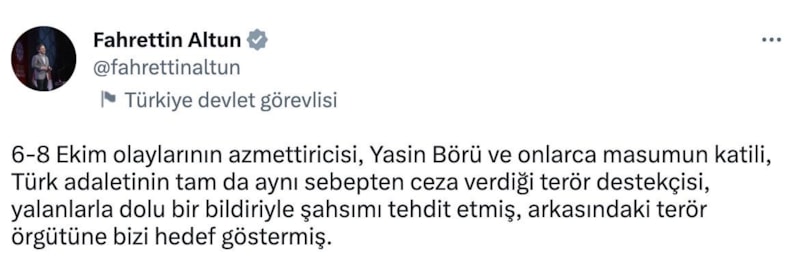 6-8 Ekim olaylarının azmettiricisi, Yasin Börü ve onlarca masumun katili, Türk adaletinin tam da aynı sebepten ceza verdiği terör destekçisi, yalanlarla dolu bir bildiriyle şahsımı tehdit etmiş, arkasındaki terör örgütüne bizi hedef göstermiş.