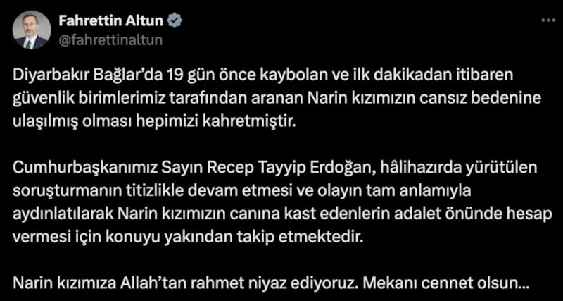 İletişim Başkanı Fahrettin Altun, Narin Güran cinayetiyle ilgili, "Cumhurbaşkanımız Sayın Recep Tayyip Erdoğan, hâlihazırda yürütülen soruşturmanın titizlikle devam etmesi ve olayın tam anlamıyla aydınlatılarak Narin kızımızın canına kast edenlerin adalet önünde hesap vermesi için konuyu yakından takip etmektedir. " dedi.