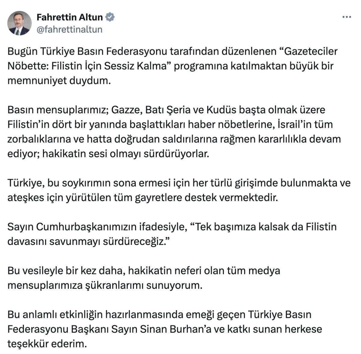Sosyal medya hesabı X'ten paylaşım yapan Altun, "Bugün Türkiye Basın Federasyonu tarafından düzenlenen 'Gazeteciler Nöbette: Filistin İçin Sessiz Kalma' programına katılmaktan büyük bir memnuniyet duydum." ifadesini kullandı.
