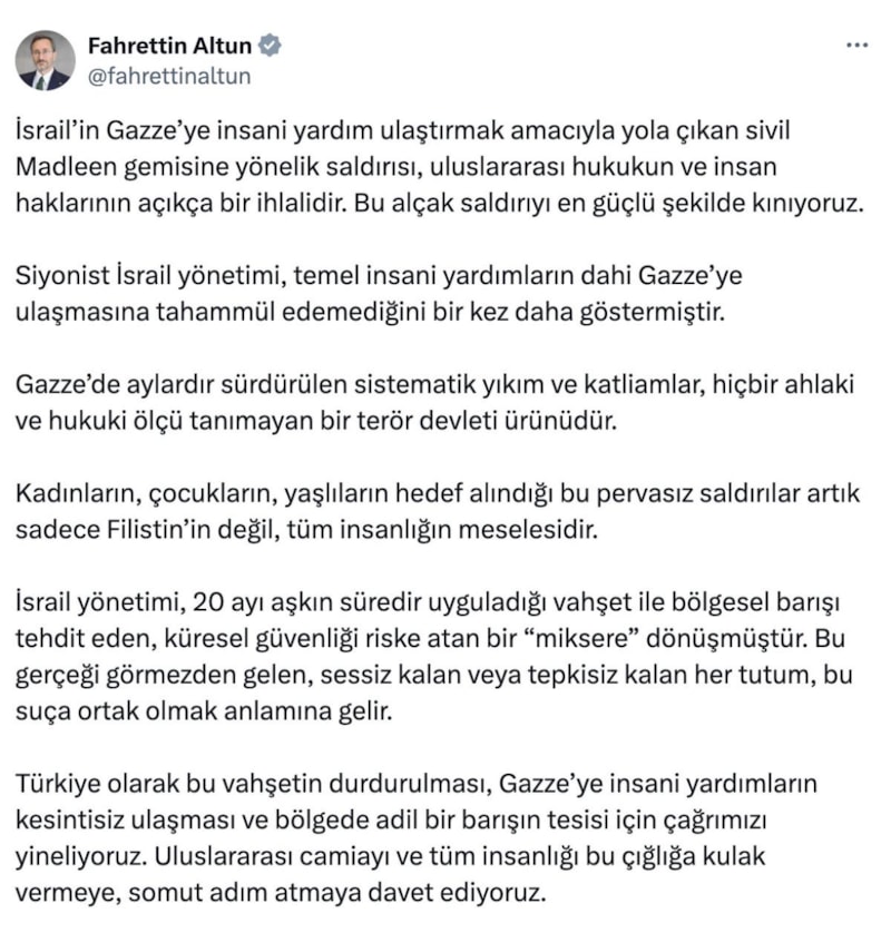 Cumhurbaşkanlığı İletişim Başkanı Fahrettin Altun, İsrail'in Gazze'ye insani yardım ulaştırmak için yola çıkan ve 12 insan hakları savunucusu aktivistin bulunduğu Madleen gemisine saldırısına ilişkin paylaşımda bulundu.