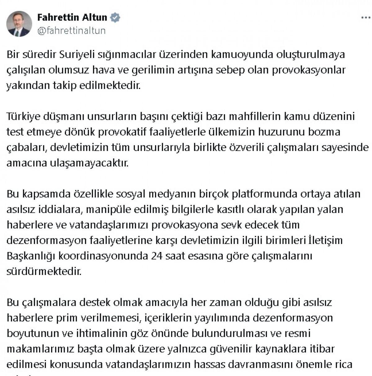 Sosyal medya hesabından açıklama yapan Altun, provokasyonlara dikkat edilmesi gerektiğini belirtti.