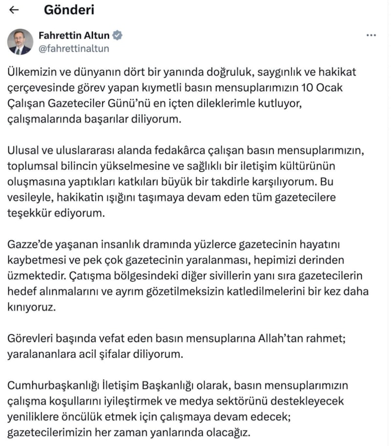 Cumhurbaşkanlığı İletişim Başkanı Fahrettin Altun, 10 Ocak Çalışan Gazeteciler Günü dolayısıyla sosyal medya hesabından açıklama yaptı.